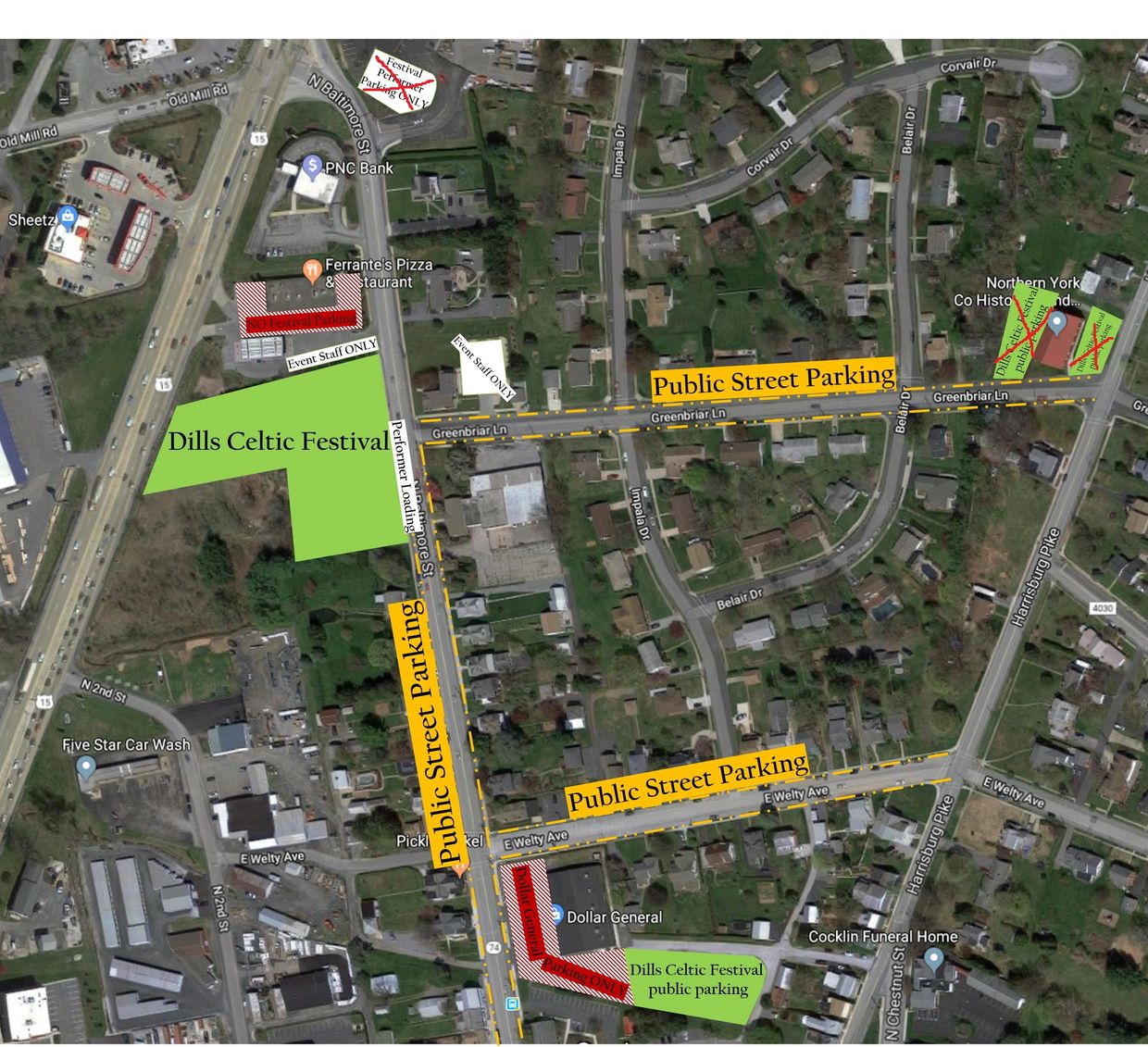 Find your way to a magical day at the Dills Celtic Festival in Dillsburg, Pa. Public street parking is available on North Baltimore St., Greenbriar Lane, E. Welty Ave., and in the lot behind the Dollar General store. While you are here feel free to experience the rich history of Dillsburg and be sure to visit the local businesses that are open. We hope you enjoy your day.